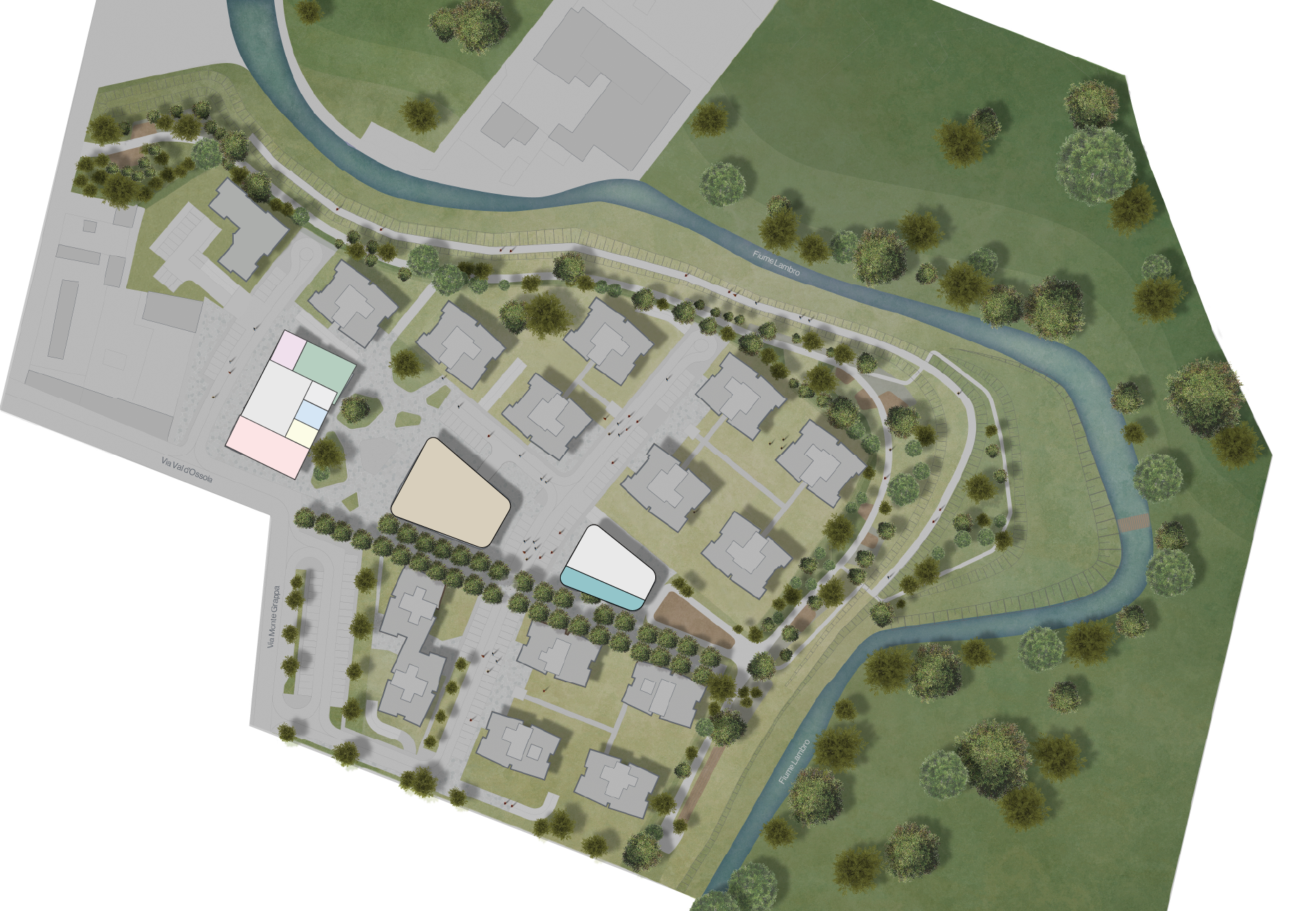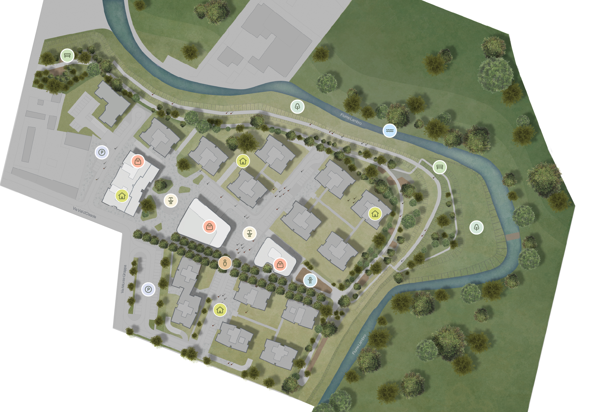 Arborea è concepito come un quartiere integrato: una grande piazza centrale con spazi retail, residenze immerse nel verde, parco urbano con aree gioco e fitness, giardini, percorsi pedonali e un pontile sul fiume Lambro. Un ecosistema urbano dove vita, legami e shopping si incontrano in un ambiente contemporaneo.